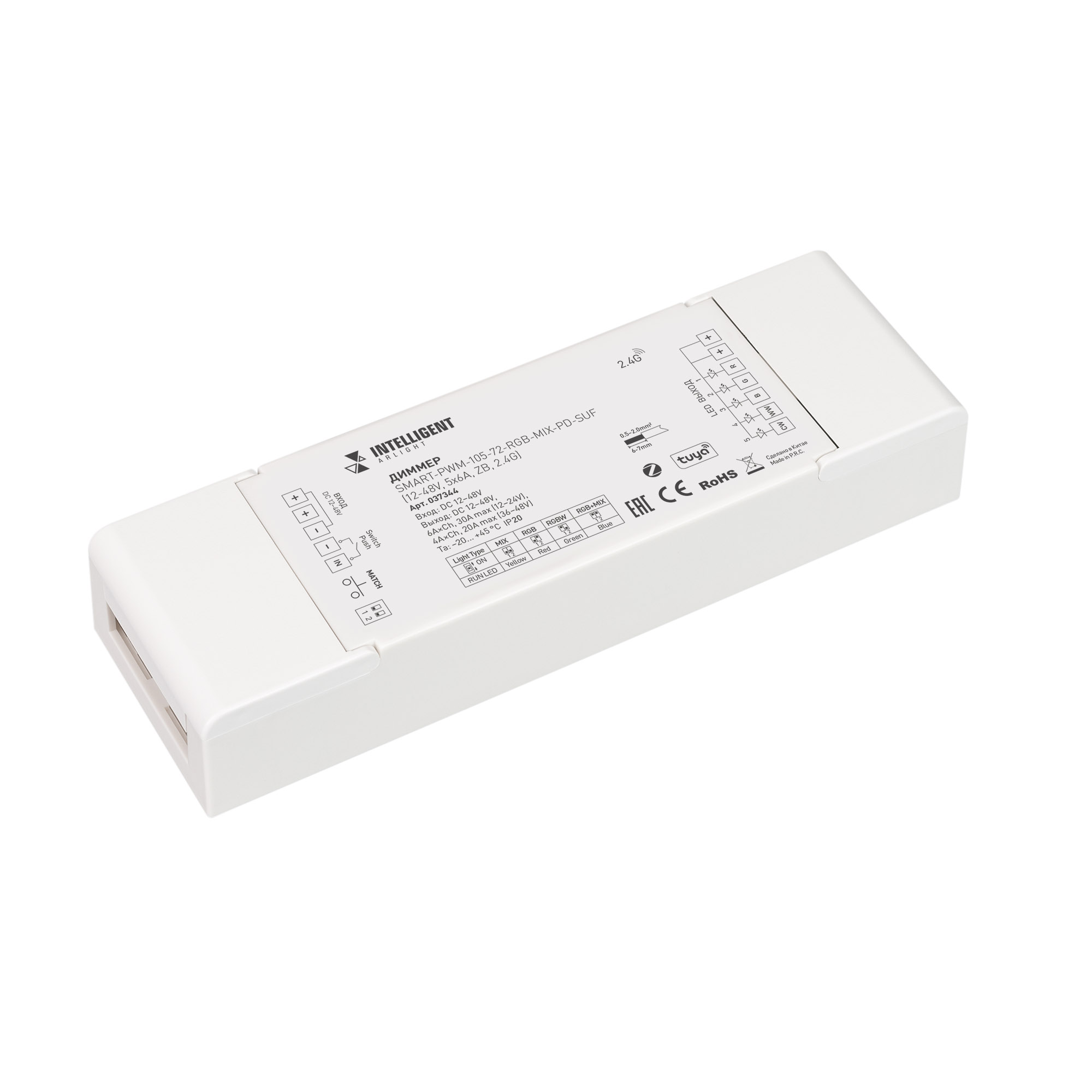 Диммер для управления любым типом (DIM/MIX/RGB/RGBW/RGB-MIX) светодиодных лент по ШИМ и другими светодиодными источниками света с напряжением питания 12-48В. Выполняет основные фукнции: включение/выключение, регулировка яркости, изменение цветовой температуры, управление цветом. Управляется по ZigBee и совместим беспроводной облачной платформой TUYA и АЛИСА от ЯНДЕКС при использовании конвертера ZigBee-wifi. Управление со смартфона через приложение SMART LIFE. Устройство совместимо с радиочастотными пультами дистанционного управления и настенными панелями управления серии SMART. Возможна привязка до 10 пультов или панелей управления. Питание от 12-48В, 5 каналов управления, максимальная нагрузка 6A на канал при напряжении 12-24V и 4А на канал при напряжении 36-48V, выходная мощность 360-960 Вт (в зависимости от напряжения питания). Габариты устройства 179x56x30 мм.