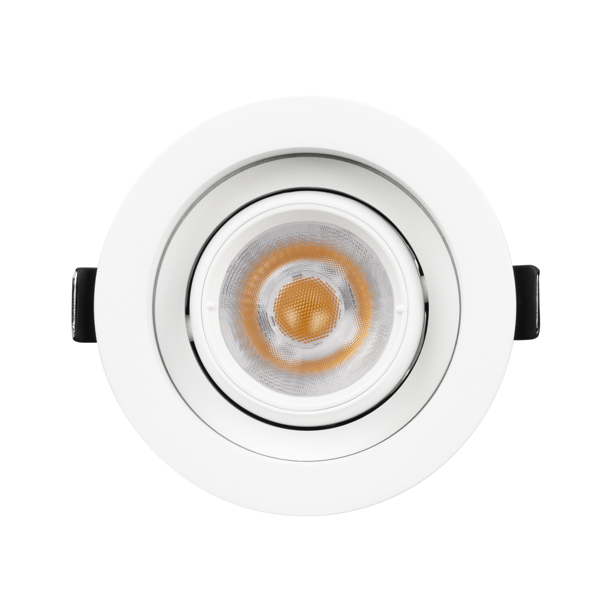 Встраиваемый карданный светильник. Мощность 12 Вт, св. поток 1394 лм, 115 лм/Вт, тёплый 3000 K, CRI>92, угол 40°, напряжение питания 230 В. Белый корпус из алюминия, белая вставка, степень защиты IP20. Размер: диаметр 90мм, высота 80 мм. Монтаж встраиваемый, установочное отверстие: диаметр 75 мм. Драйвер 27-40 В, 300 мА, пульсация <2%.