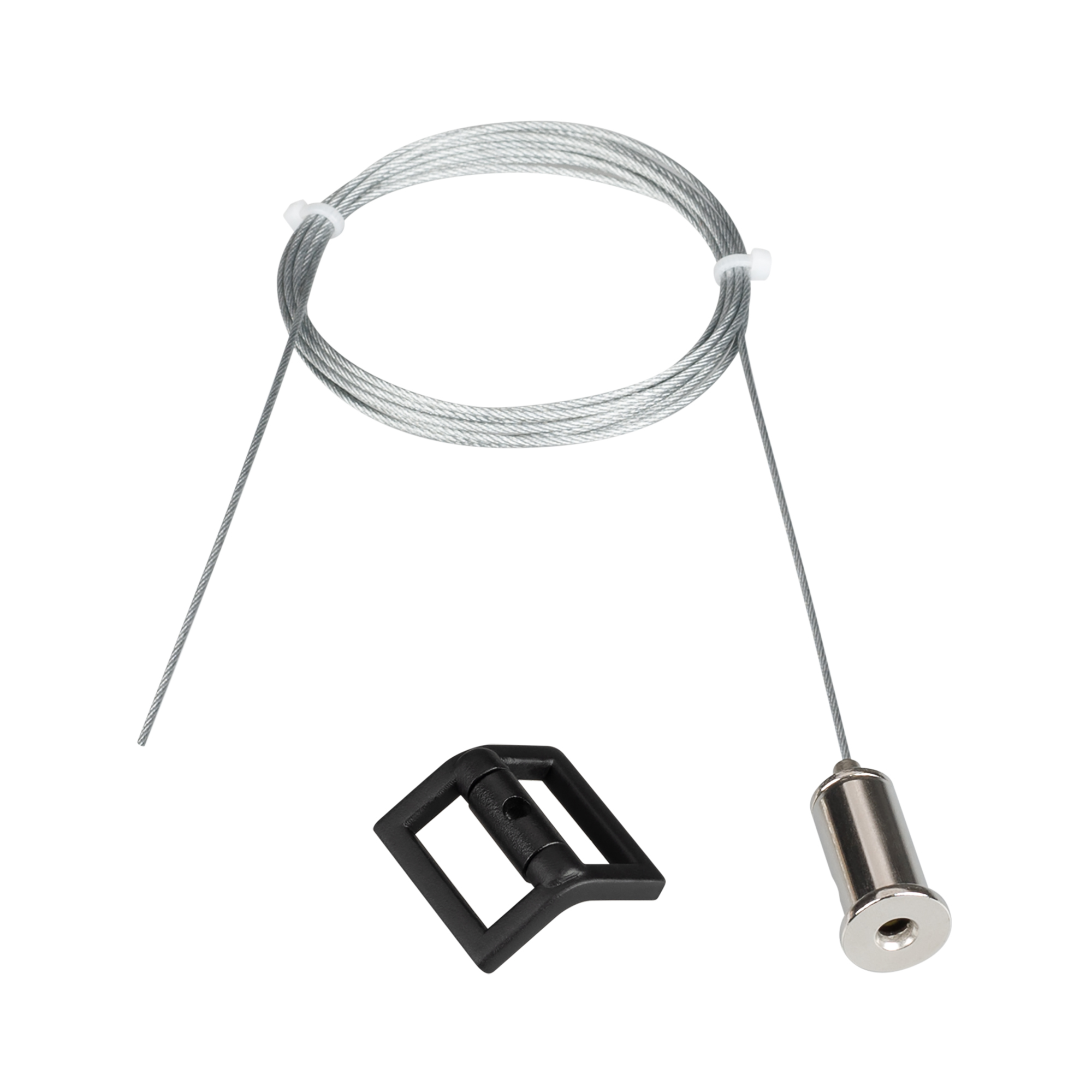 Подвес-фиксатор для токопроводящего ремня серии ART-INBELT. Размер: 28x28x12 мм. Цвет: черный. Материал: пластик + алюминий. Монтажный крепеж и стальной трос поставляются в комплекте. ∅1.2х2000мм