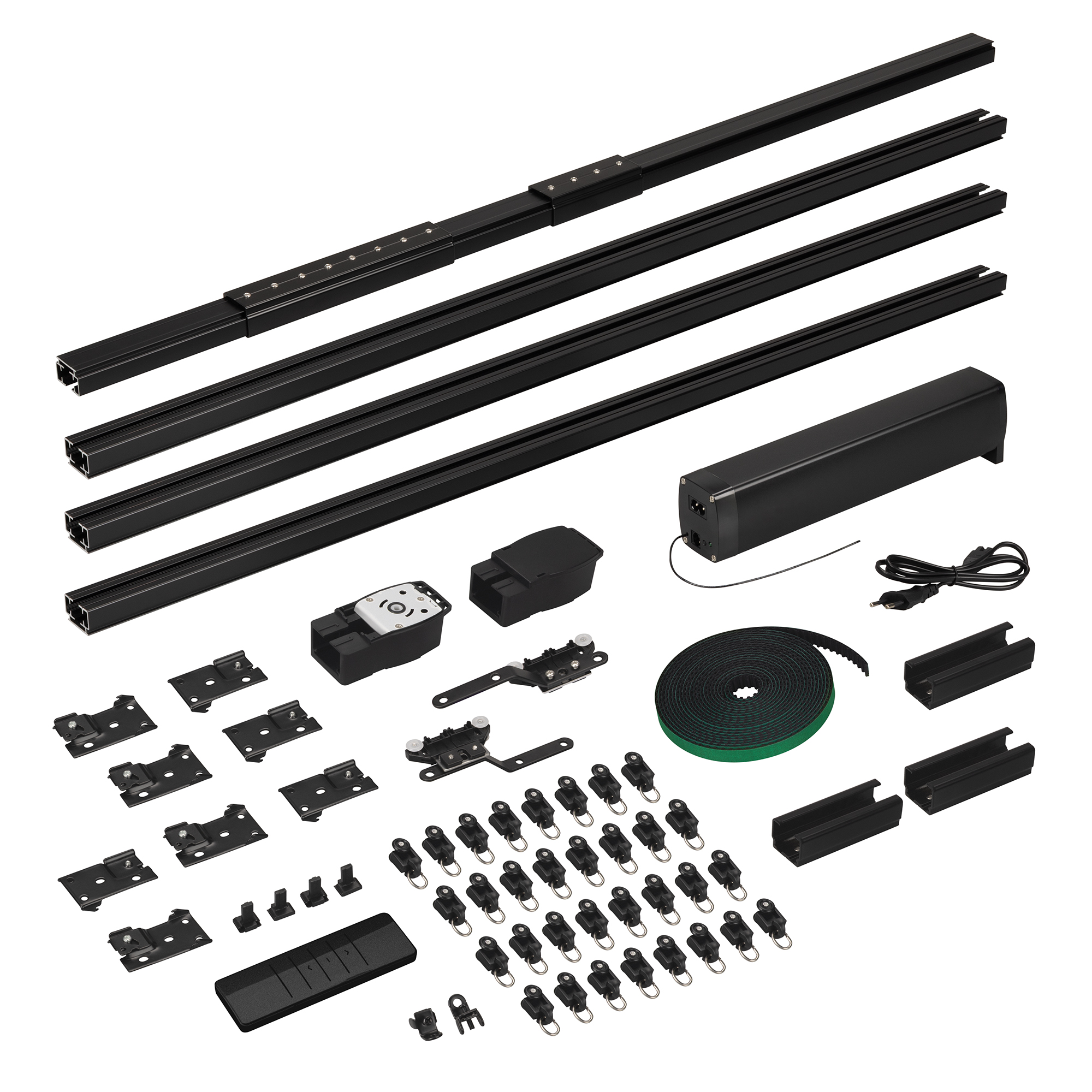 Комплект электрокарниза в черном цвете длиной до 4м (регулируется наборными частями) для раздвижных штор, состоящий из мотора, наборного алюминиевого трека, пульта и комплектующих. Электропривод с питанием 100-240В, мощность 45Вт, момент 1.2Нм, вес штор до 40кг. Управление с помощью пульта из комплекта, по WI-FI, 2.4ГГц, Bluetooth, "сухими" контактами на входе RJ45. Совместим с платформой TUYA, АЛИСА от ЯНДЕКС. Управление со смартфона через приложение SmartLife, с помощью пульта в комплекте. Ремень из комплекта находится на дне коробки. 1 мотор, 1 пульт дистанционного управления, алюминиевый профиль 1,6 мм (1м - 3шт, 0.5м - 1шт, 0.2м - 2шт., 0.1м - 1 шт.), 3 соединителя 10 см, 1 соединитель 20 см, 1 переходник 5 см, 2 шкива, 2 пряжки ремня, 2 направляющих бегунка, ремень 8,4 м, 24 бегунка, 2 фиксатора, 8 кронштейнов, 1 зажим на ремень