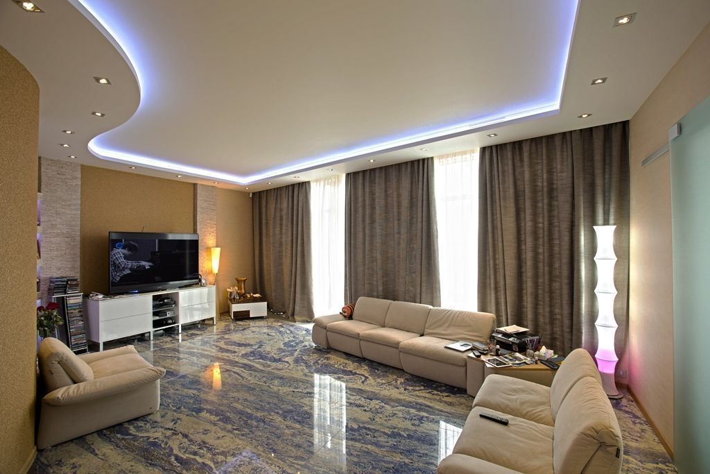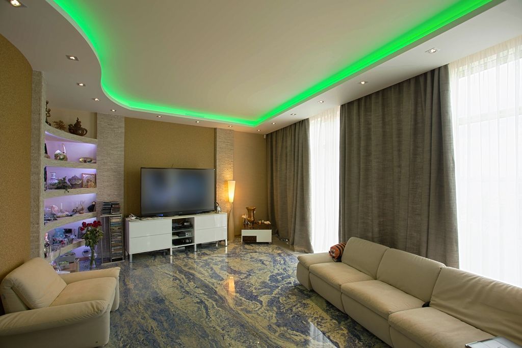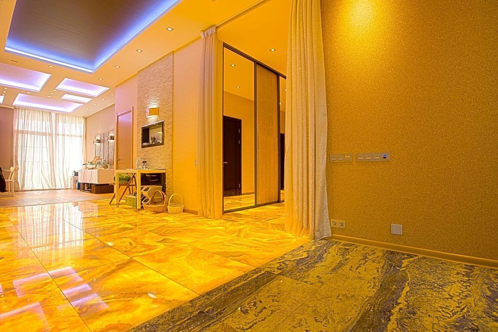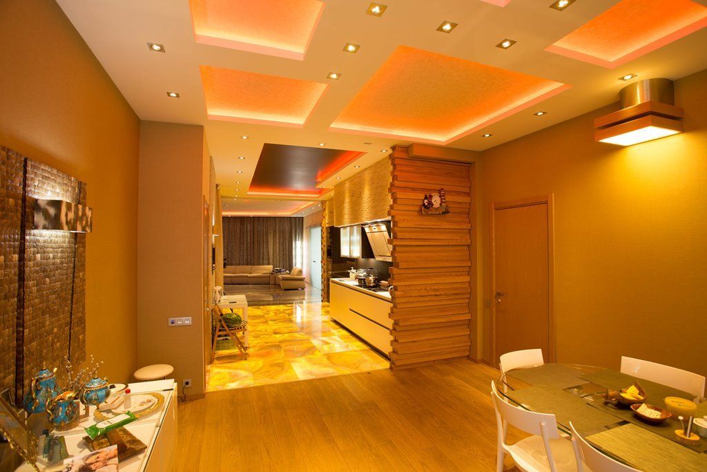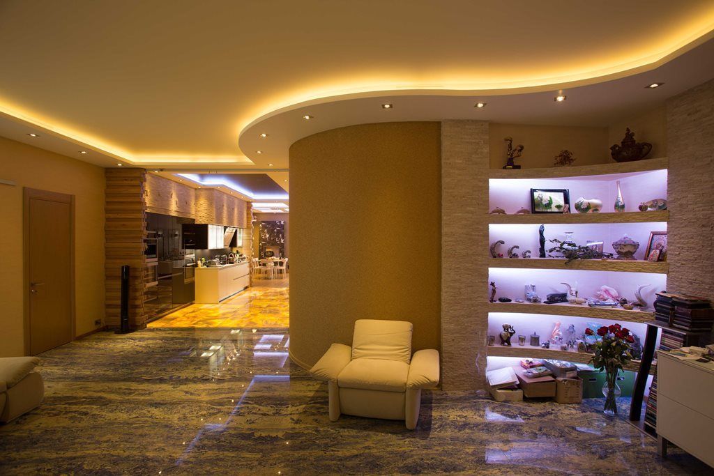 Проект квартиры со светодиодной многоцветной подсветкой, установленной на многоуровневых потолках. Основной изюминкой данного интерьера стал пол из оникса со светодиодной подсветкой. Для реализации проекта использовалось светодиодное оборудование торговой марки arlight®.