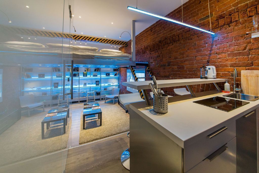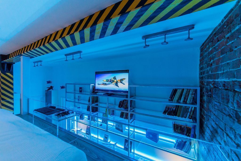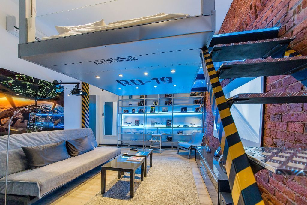 Светодиодная подсветка и светодиодное освещение в квартире-студии дополняет интерьер, выполненный в авиа-тематике.