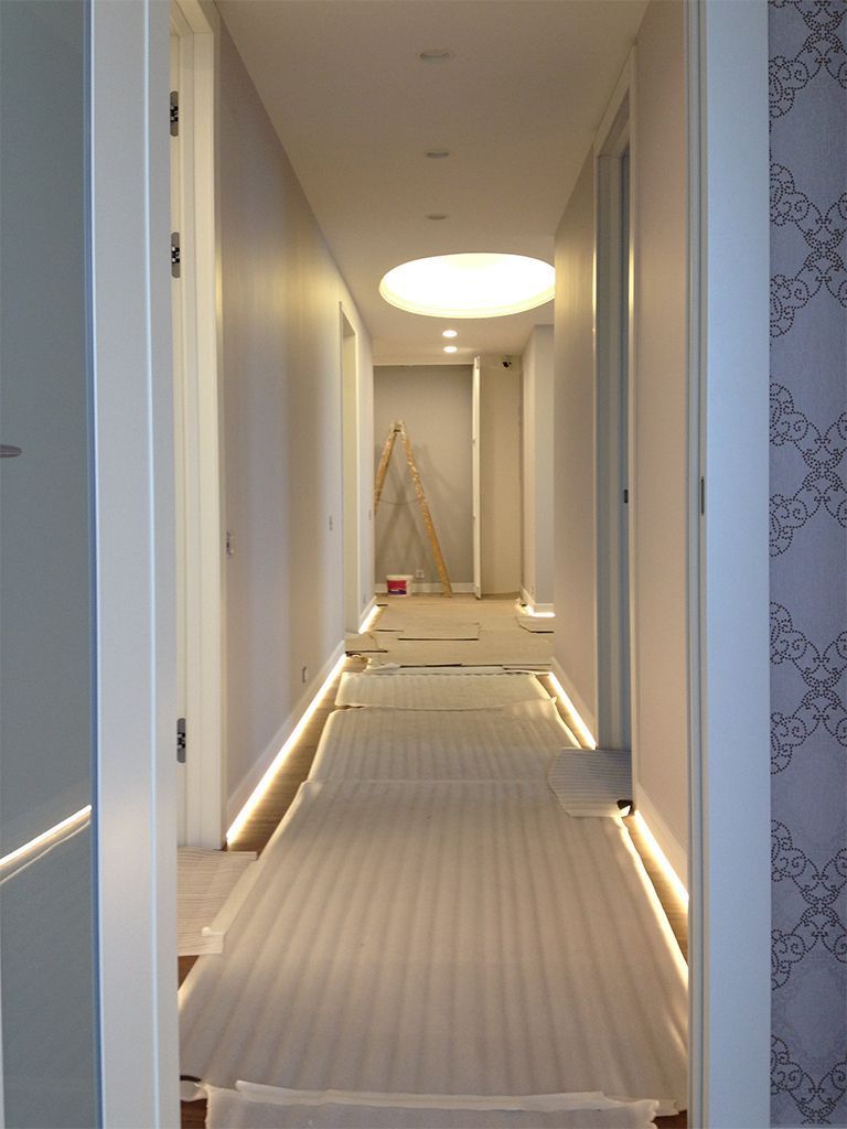 Для освещения прихожей и большого коридора были использованы встраиваемые светодиодные светильники arlight®. Они обеспечивают яркое освещение но при этом потребляют мало электроэнергии. В коридоре также была организована подсветка пола, для этого светодиодная лента была установлена в плинтус и затем закрыта матовым экраном для создания эффекта линий света.