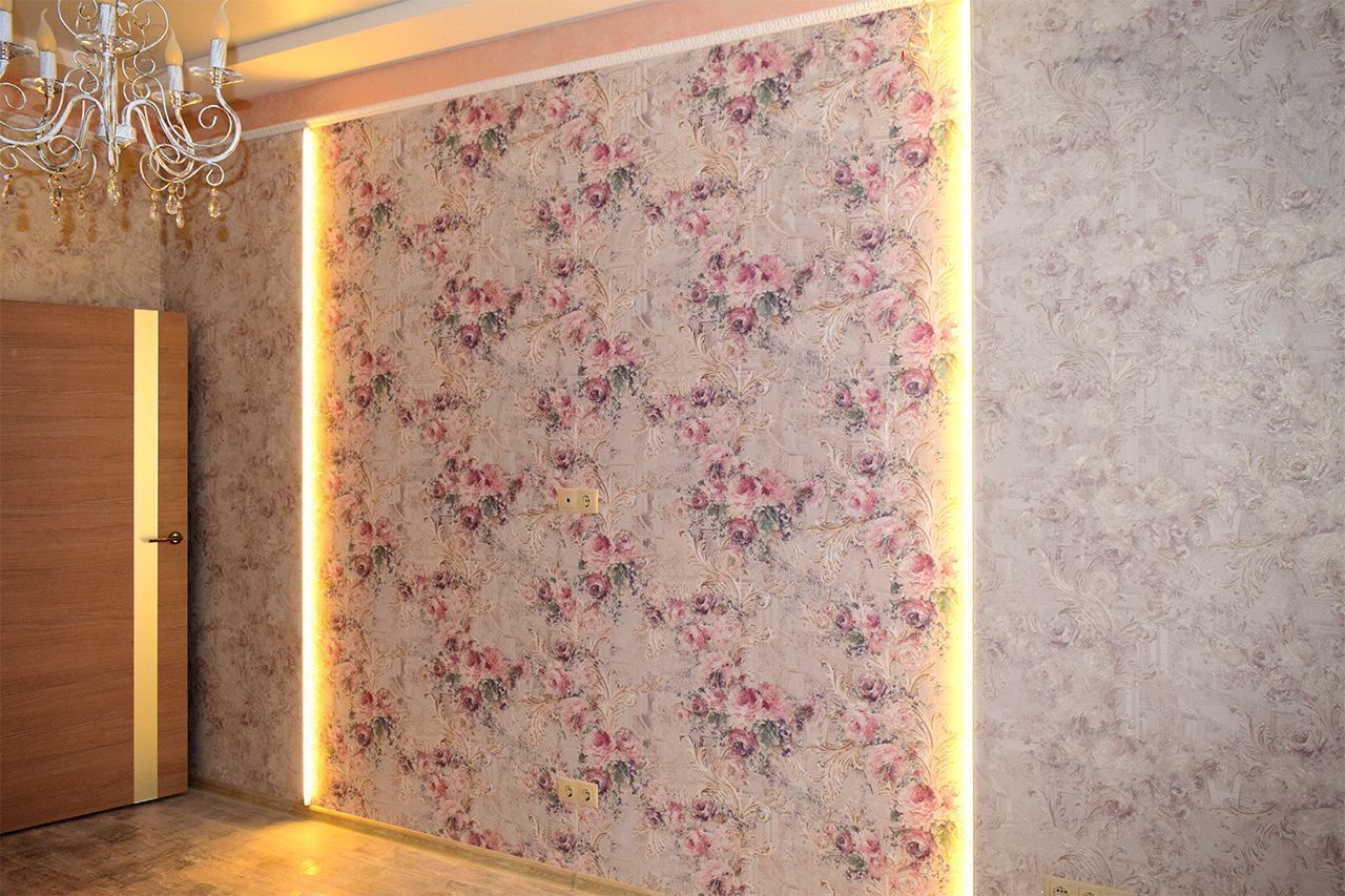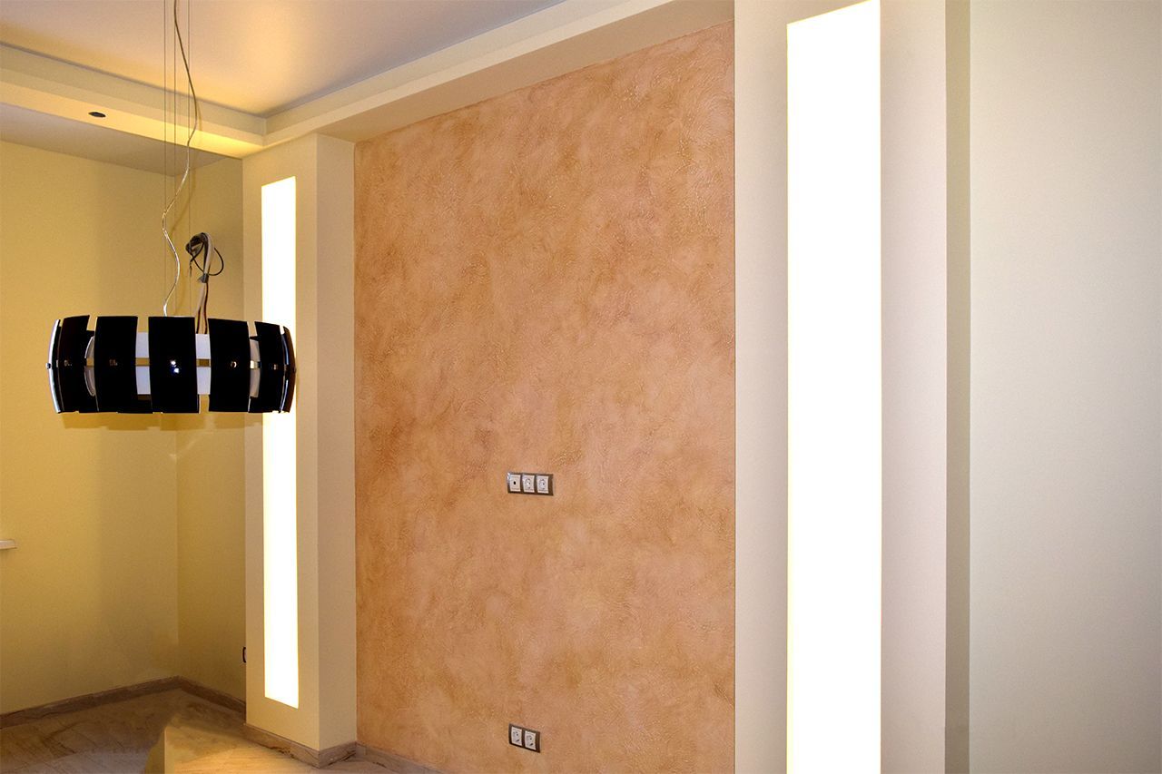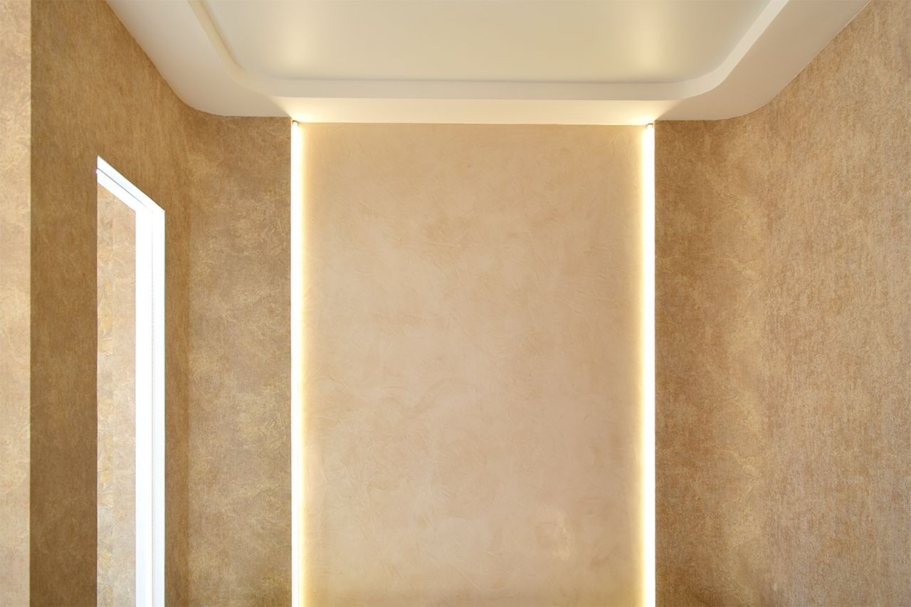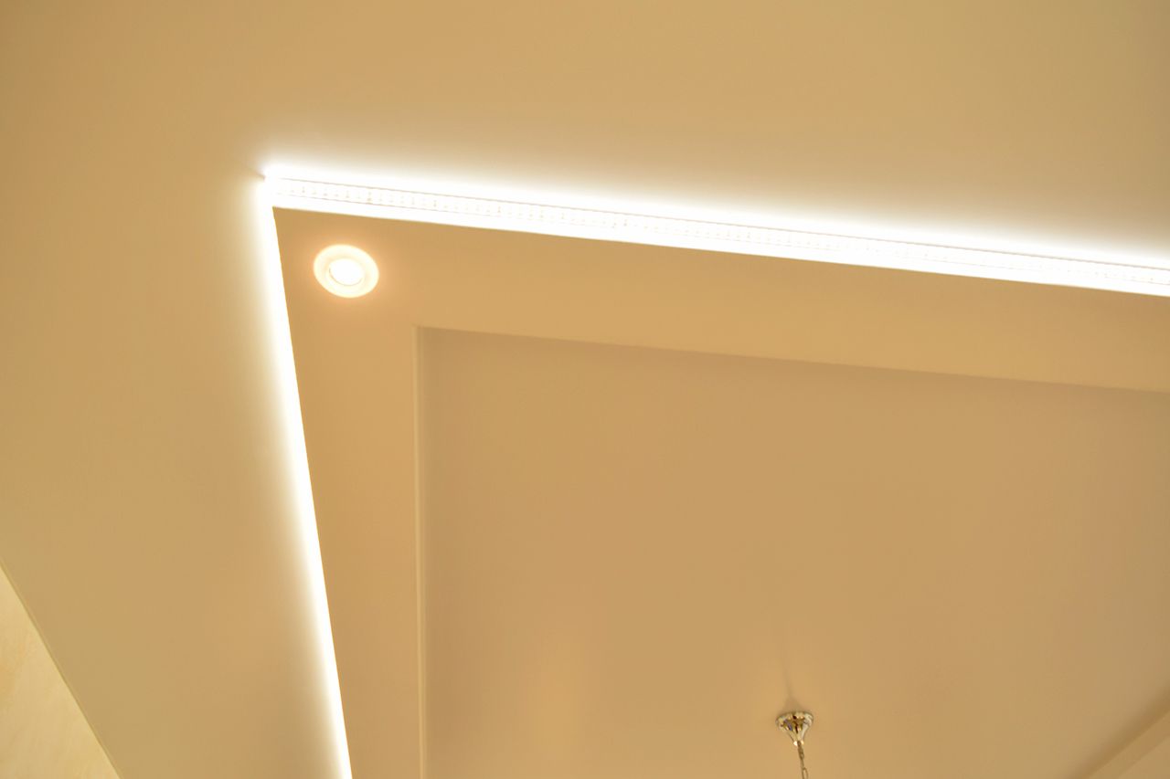 Дополнительное светодиодное освещение в многоуровневом потолке из гипсокартона. Зонирование помещения вертикальными линиями света.